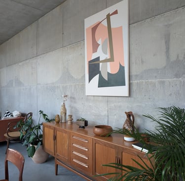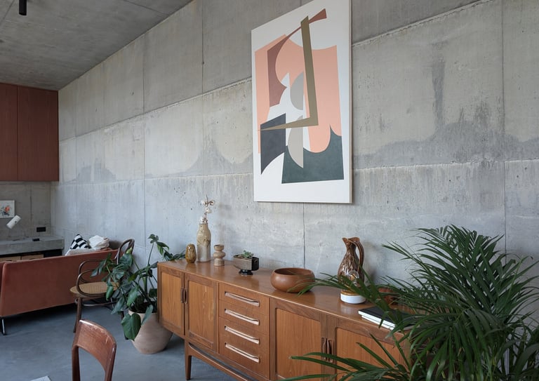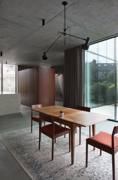 An exposed concrete canvas with high ceilings and an abundance of natural light, featuring a palette of terrazzo, warm sapele timber & mid century modern interior.