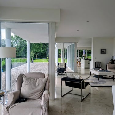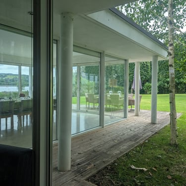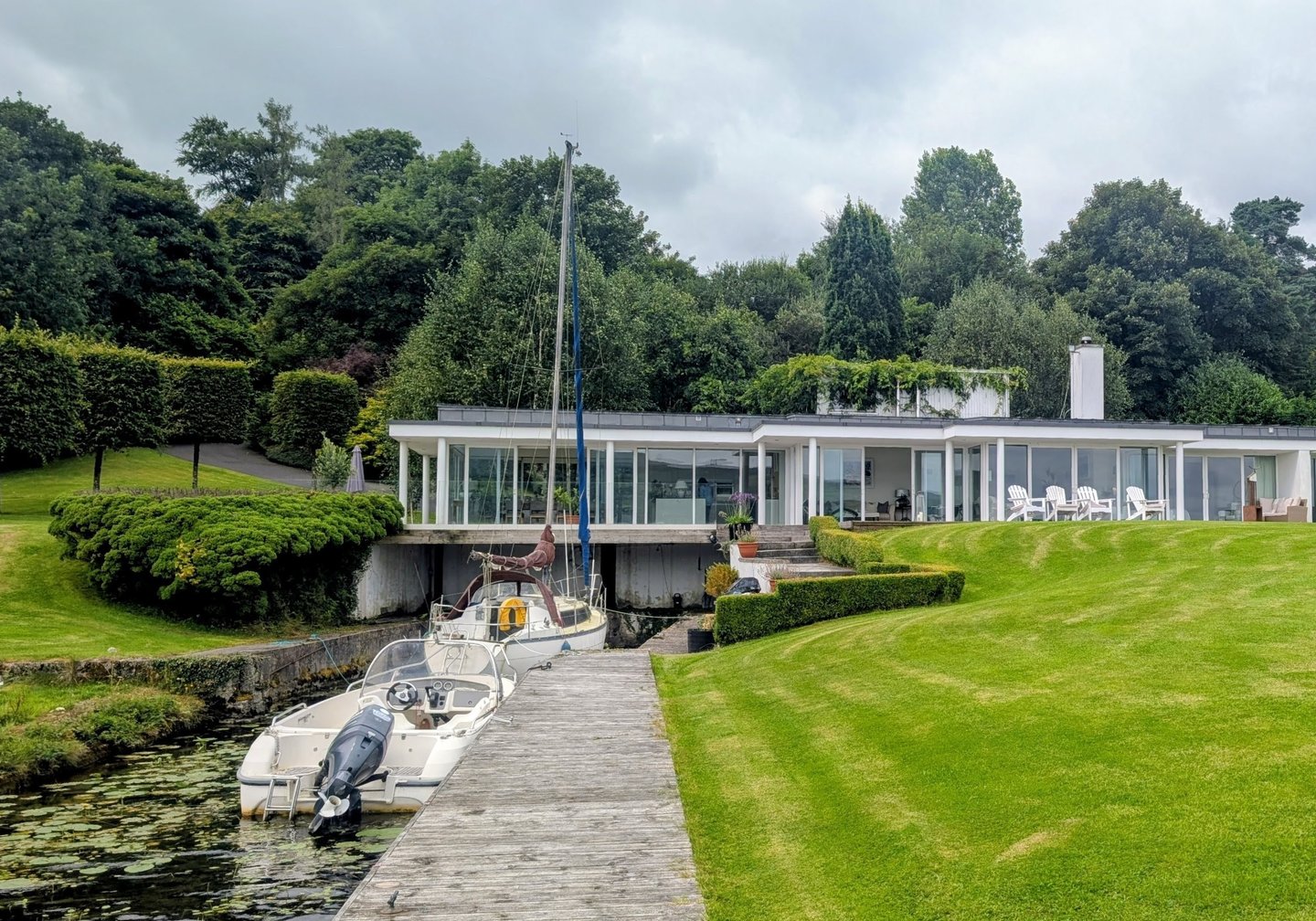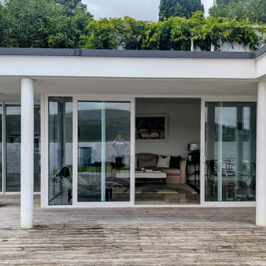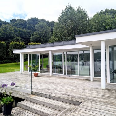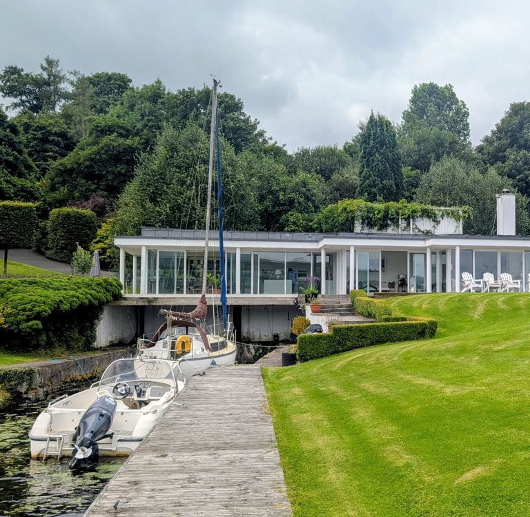 The Glasswater House is a striking example of International Style modernism, offering a rare "chameleon" location in the heart of the Mid West of Ireland. Defined by its crisp white steel-and-glass structure, the property sits low in the landscape, providing an uninterrupted dialogue between its sophisticated interiors and the beauty of the surrounding lake and trees.