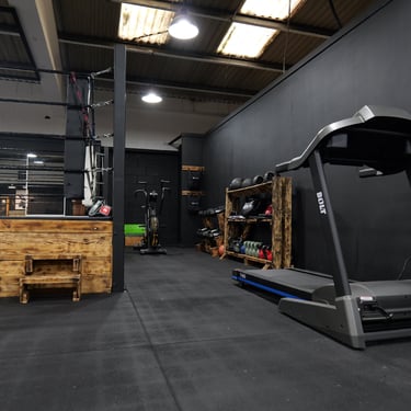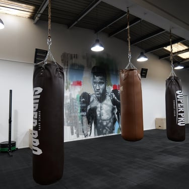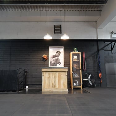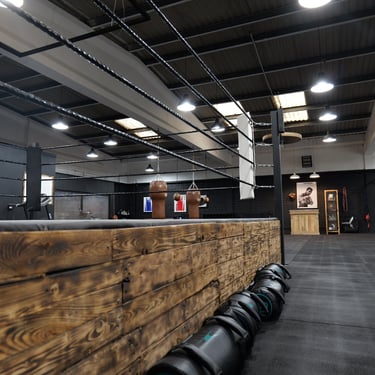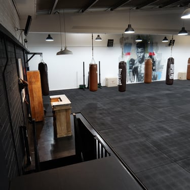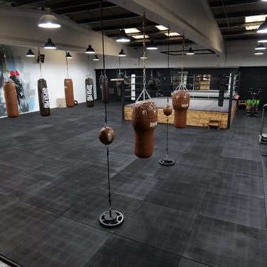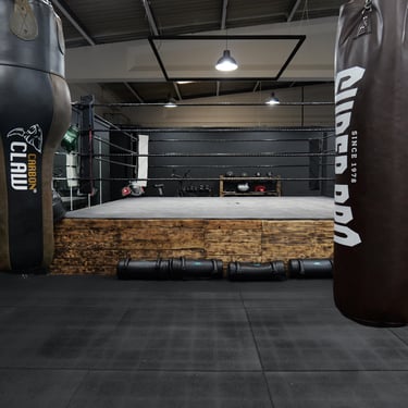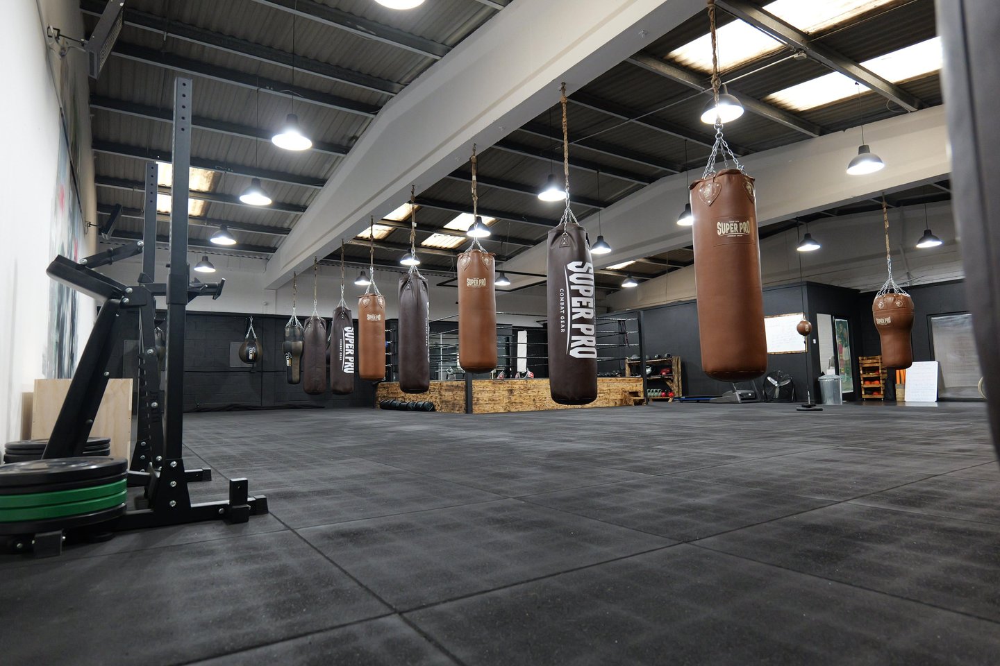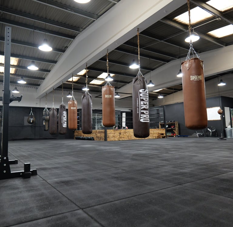 A large industrial fitness studio space with full boxing ring and boxing circuits setup. Carpark facility