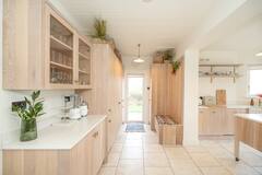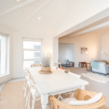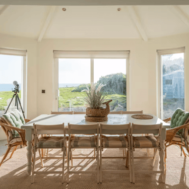 This clifftop home features light, neutral interiors with a clean Scandinavian style. Large windows fill the space with natural light and showcase stunning ocean views.